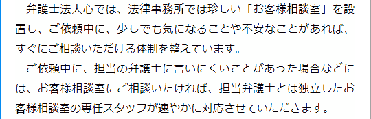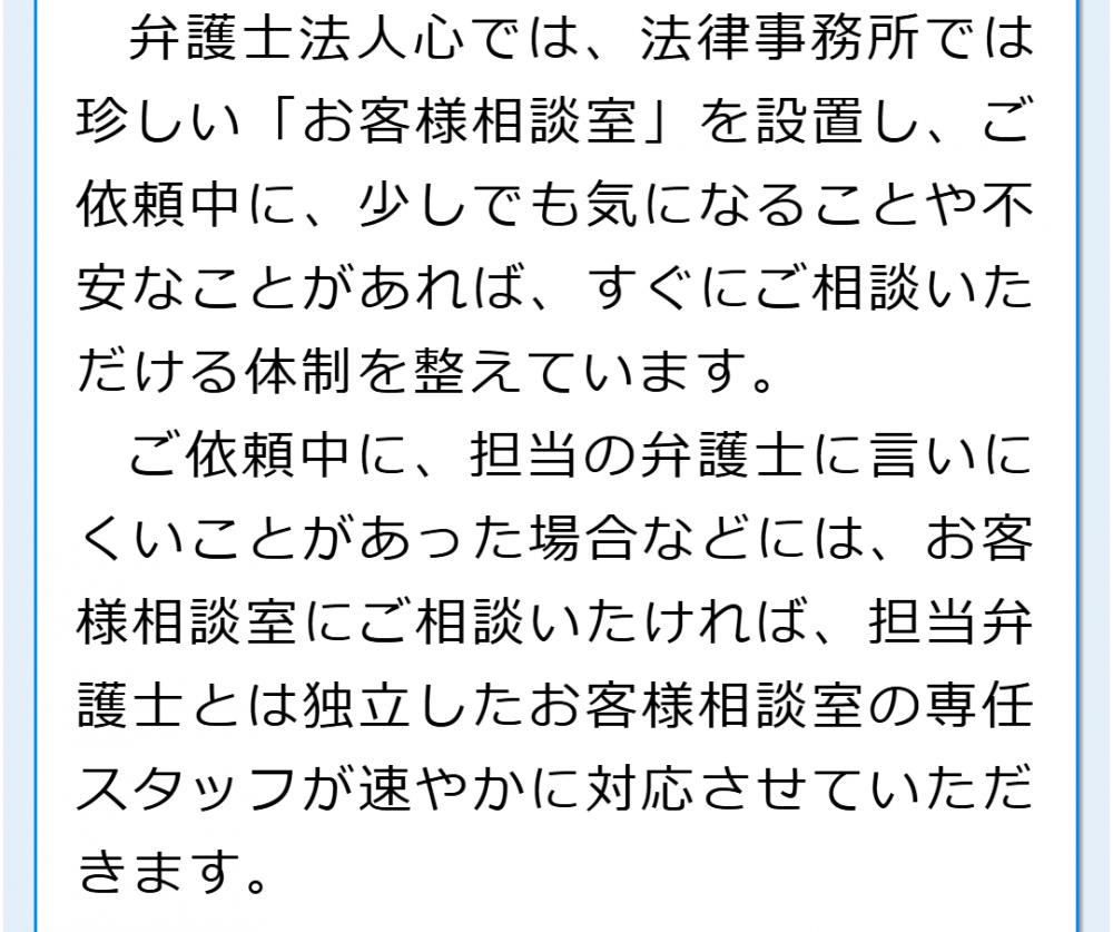 当法人では、任意整理の案件を解決するだけでなく、当法人に依頼して良かったと思っていただけるよう、お客様相談室を設置してサービスの向上を図っています。